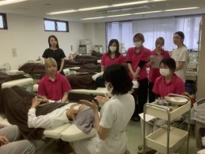 先生の指示に従って、コットンで患者様の顔の化粧を落としていく練習です![]()